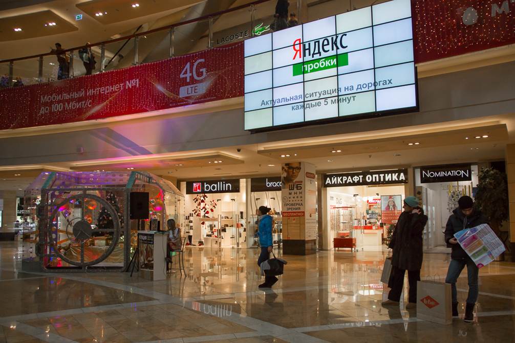 Данные «Яндекс.Пробок» и «Яндекс.Погоды» появились в 28 торговых центрах Москвы. На 44 экранах показываются температура на улице, балл пробок и фрагмент карты с пробками в районе торгового центра. Актуальная информация транслируется на видеостены каждые 5–10 минут, продолжительность одного показа составляет 15 секунд.