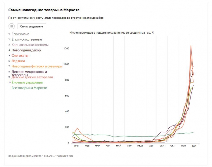 В середине декабря на «Яндекс.Маркете» число переходов в магазины достигает годового максимума. В этот раз во вторую неделю месяца люди отправлялись на сайты продавцов на 35% чаще, чем в среднем за год.