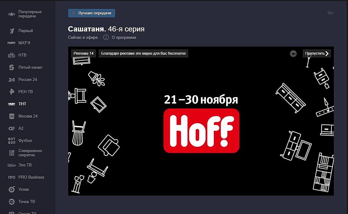 Весной 2017 года Яндекс поместил на свою главную страницу кнопку «ТВ онлайн» и начал тестировать показ телевизионных передач. Сейчас на главной и странице Яндекс.Телепрограммы транслируется прямой эфир и программы в записи «Первого канала», НТВ, ТНТ, РЕН ТВ, «Пятого канала», «России-24», RT и др. — всего 27 каналов. Яндекс планирует пополнять список федеральными и региональными российскими каналами, а также зарубежными ТВ-игроками, сообщила руководитель группы развития рекламы компании Ирина Скрипникова.