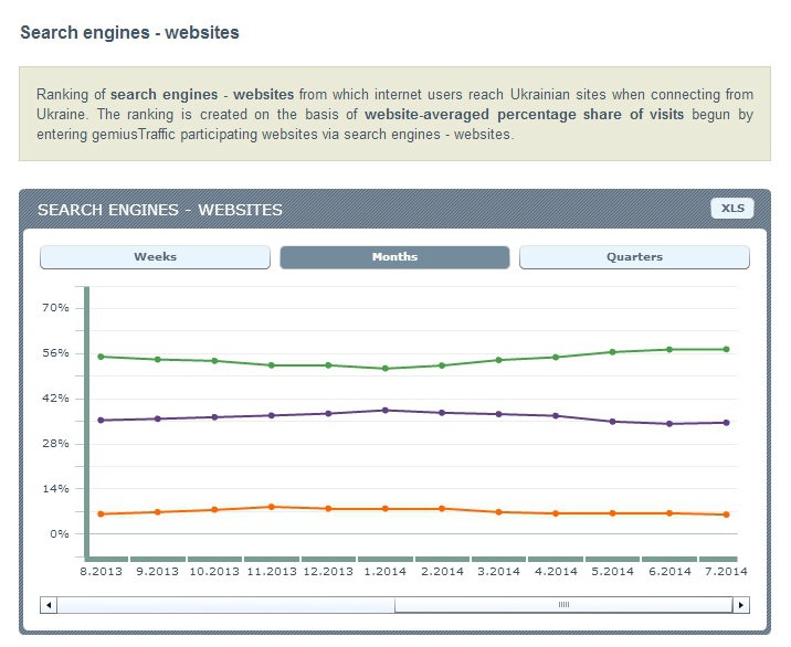 Российские счетчики действительно фиксируют рост трафика «Яндекса» на Украине, но как новостного, так и поискового. Согласно LiveInternet, суммарное количество переходов из поисковой системы в январе равнялось 31,6%, а к июлю выросло до 33,4%. Новостной трафик увеличился до 29,1% с 22,8%.