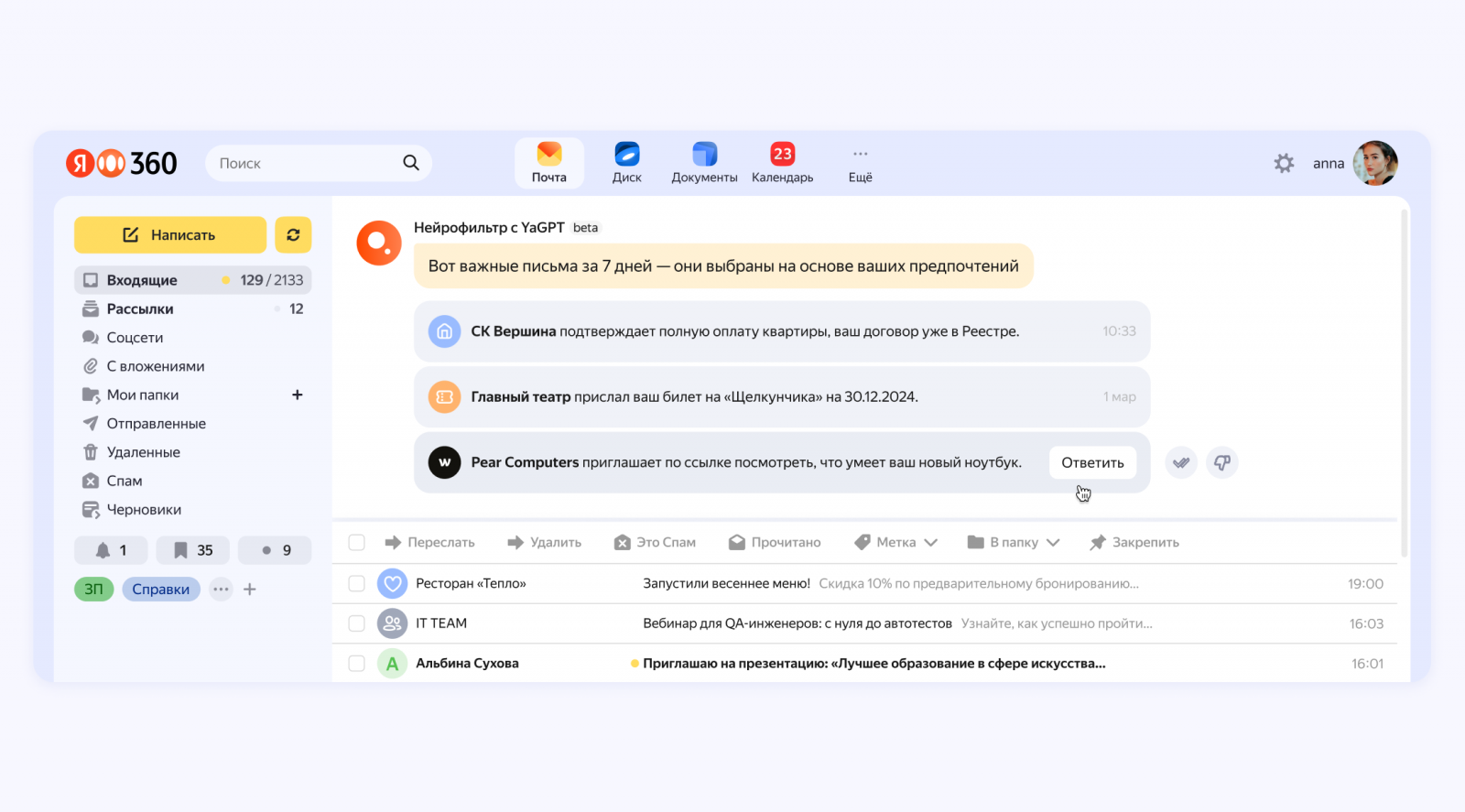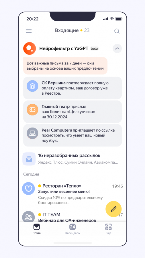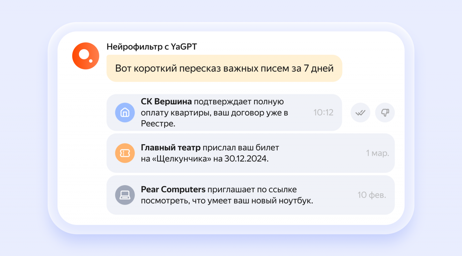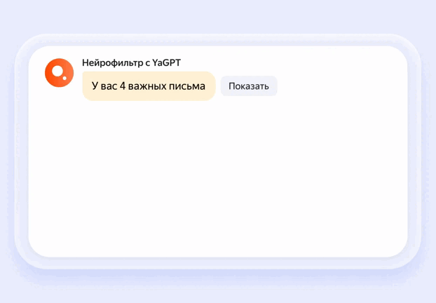 Как уточнил Проценко, при отборе технология учитывает больше тысячи факторов. Суммаризацию — извлечение из писем краткой сути — выполняет нейросеть YandexGPT. При этом она делает пересказ лишь тех писем, которые выделила «Спамооборона», и только у тех пользователей, которые включили функцию.