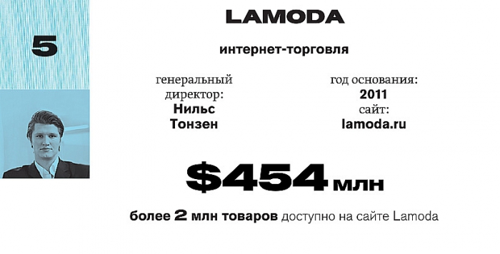 Второе место в рейтинге занимает Mail.ru Group (стоимость 6,86 миллиарда долларов), которая продолжает расширять портфель активов. Замыкает тройку лидеров электронная доска объявлений Avito (2,734 миллиарда долларов). Четвертое место досталось одному из крупнейших интернет-магазинов на российском рынке Wildberries (602 миллиона долларов), пятое — онлайн-ритейлер одежды и обуви Lamoda (454 миллиона долларов), шестое — Ozon Group (369 миллионов долларов), седьмое — сервис онлайн-бронирования Biletix (264 миллиона долларов), восьмое — онлайн-ресурс поиска работы HeadHunter (228 миллионов долларов). На девятой строчке — онлайн-дискаунтер «Ситилинк» (224 миллиона долларов). Замыкает десятку сервис геолокации 2ГИС (211 миллионов долларов).