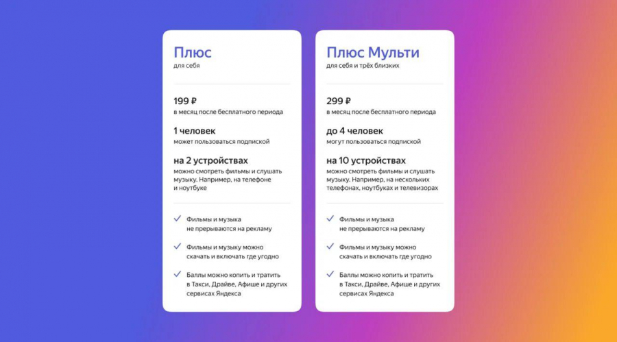 Теперь в системе «Яндекса» будет два варианта подписки. «Плюс» подойдет для одного человека, а «Плюс Мульти» — для семьи. Новые пользователи смогут оформить первую за 199 рублей, а вторую — за 299 рублей в месяц (сейчас подписка стоит 169 и 269 рублей соответственно).