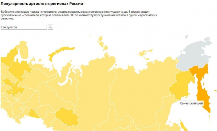 В исследовании представлена карта, по которой можно увидеть где слушают того или иного артиста. Например, рэпера Oxxxymiron плотно слушают только на Камчатке.
