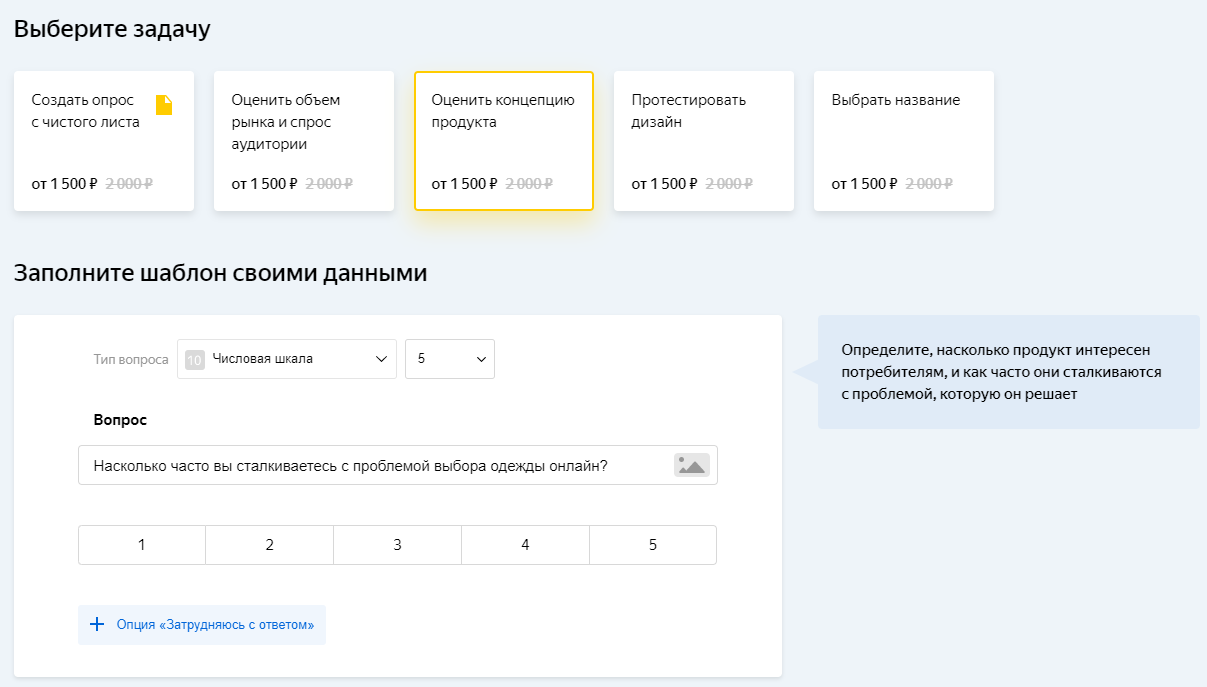 С помощью шаблонов в «Яндекс.Взгляде» можно оперативно решать маркетинговые задачи: оценить объём рынка, спрос аудитории, узнать мнение аудитории о дизайне, идее или цене товара — принять решение о продукте на основе данных. Сейчас доступно четыре шаблона, в ближайшем будущем будут добавлены другие.