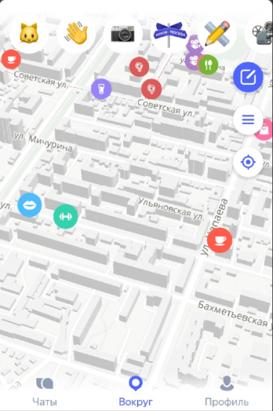 Приложение определяет положение мобильного устройства пользователя и предлагает ему ближайшие к нему чаты. Это могут быть тематические группы с обсуждением конкретного кафе, кинотеатра или же просто группа для разнообразных бесед.