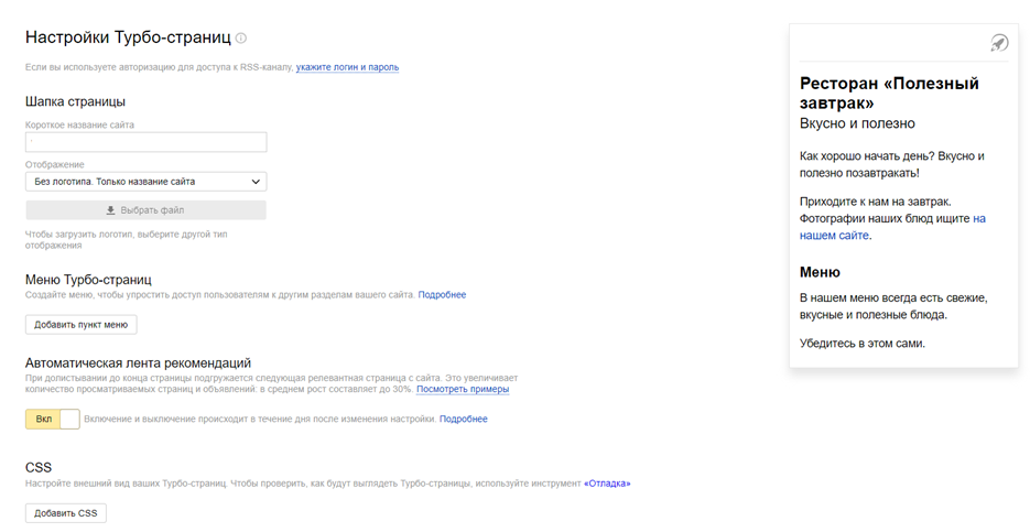 Приоритет всё-таки остается за настройками RSS-фида площадки: если в них заданы собственные рекомендации, именно они будут использованы для «бесконечной» ленты. Однако даже если собственные рекомендации подобраны только для части «турбо-страниц», для остальных можно использовать автоматическую ленту.