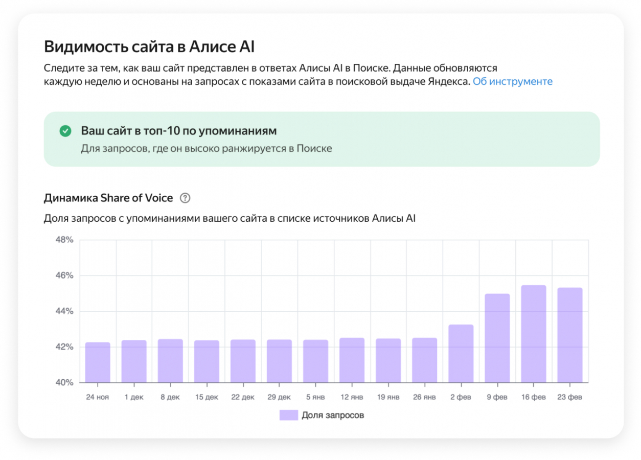 Данные помогают сопоставлять представленность площадки с конкурентами и использовать аналитику для улучшения качества контента отдельных страниц, включая товары и услуги. Это может увеличить вероятность попадания сайта в ИИ-ответы и повысить его видимость для пользователей.