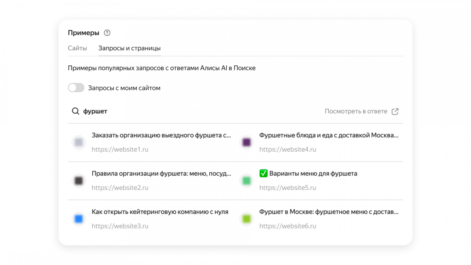 С помощью нового инструмента компании могут отслеживать долю запросов, в которых их сайты упоминаются как источник информации. Также доступны примеры пользовательских запросов и перечень сайтов аналогичной тематики, которые регулярно появляются в ответах.