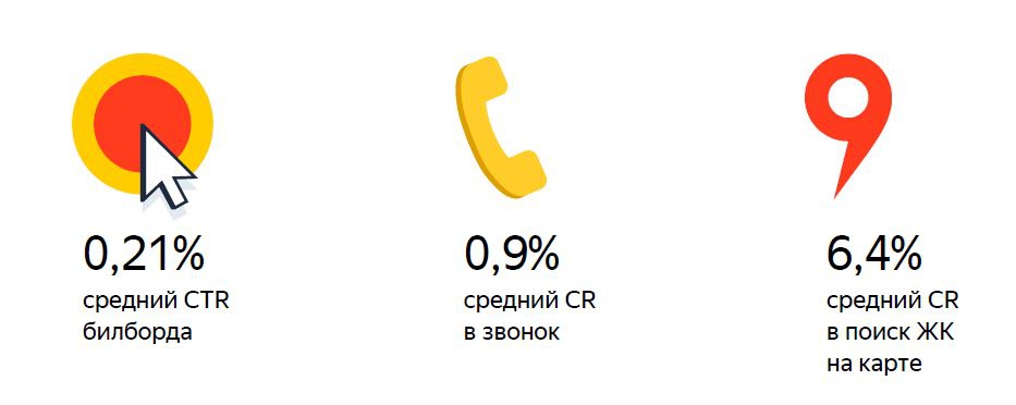 Охватная кампания получила 82% показов. Те, кто кликал на билборды в Навигаторе, хорошо конвертировались в звонки и поиск адресов ЖК на карте: средняя конверсия в звонок составила 0,9%, в поиск ЖК на карте — 6,4%.