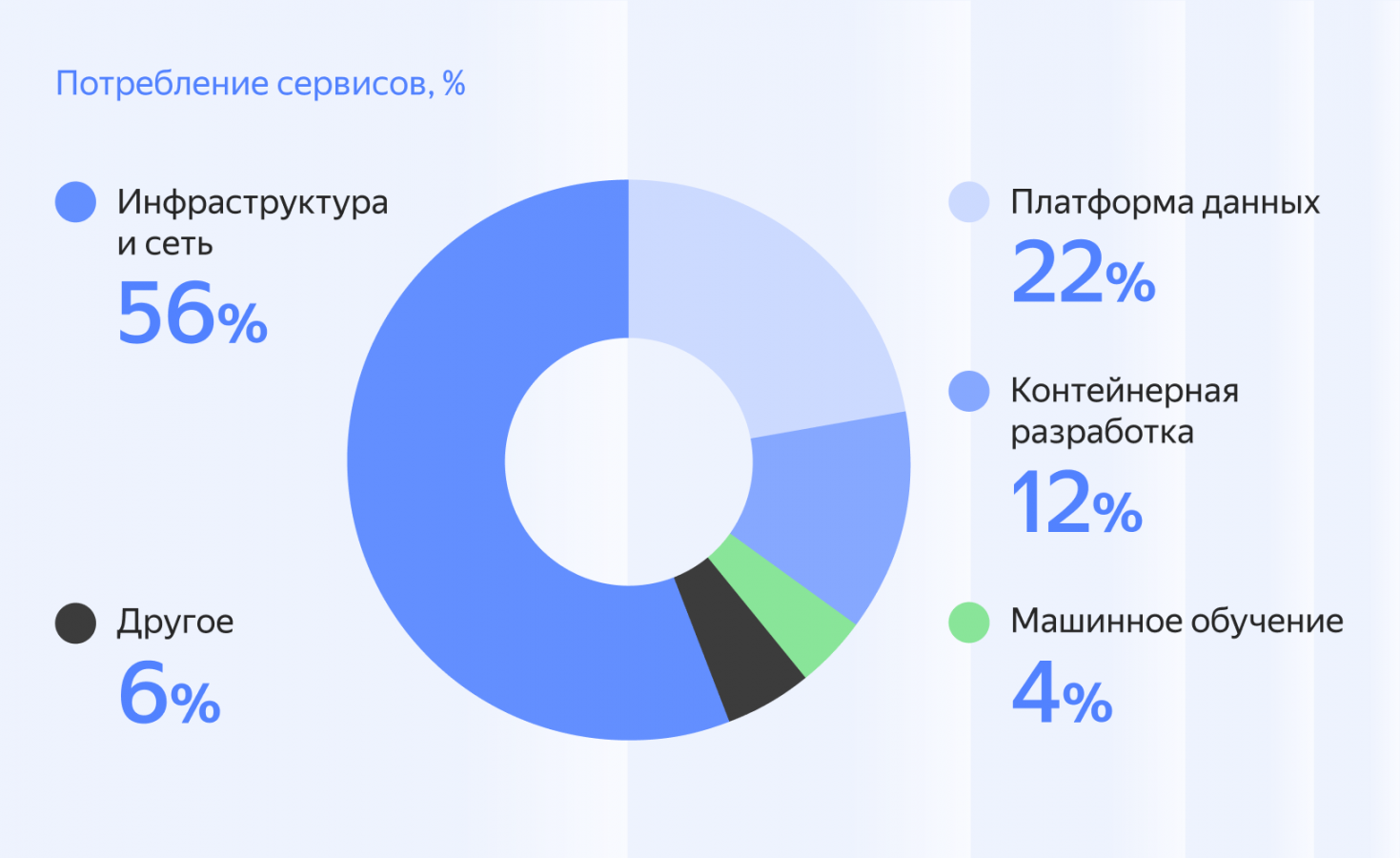 56%-ая доля в потреблении сервисов пришлась на инфраструктуру и сеть, 22% — на платформу данных, 12% — на контейнерную разработку и 4% — на машинное обучение.