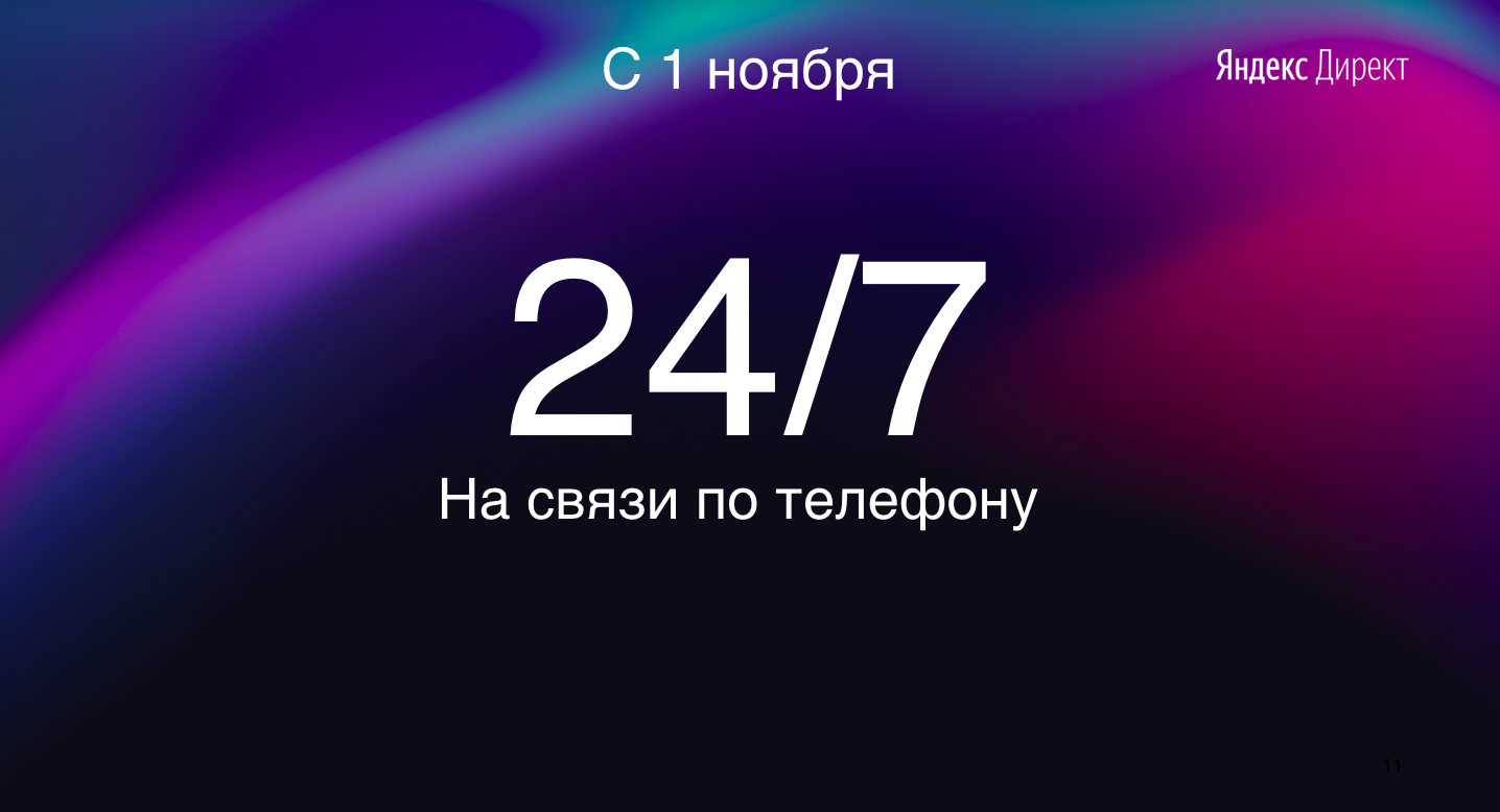 Большой анонс от Леонида — уже этой осенью поддержка Директа перейдет на круглосуточную работу по телефону! Компания заботится о клиентах из разных часовых поясов. Теперь связываться с Яндексом будет удобнее и быстрее.