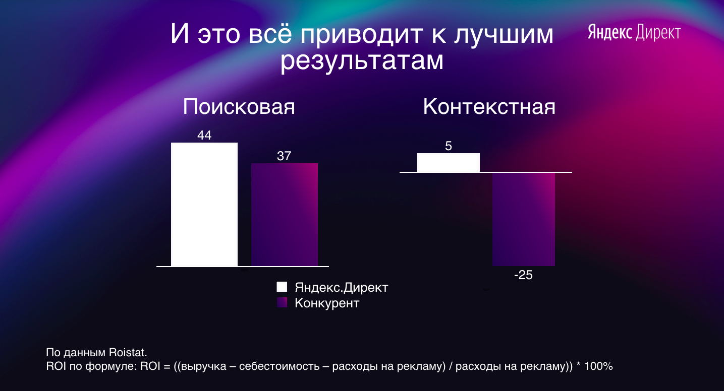 Яндекс.Директ показывает лучшую окупаемость в поисковой и контекстной рекламе по сравнению с конкурентом-которого-нельзя-называть (ладно-ладно, Google Ads). Источник данных – ежегодное исследование ROISTAT, который сравнивает окупаемость разных рекламных систем у своих клиентов.