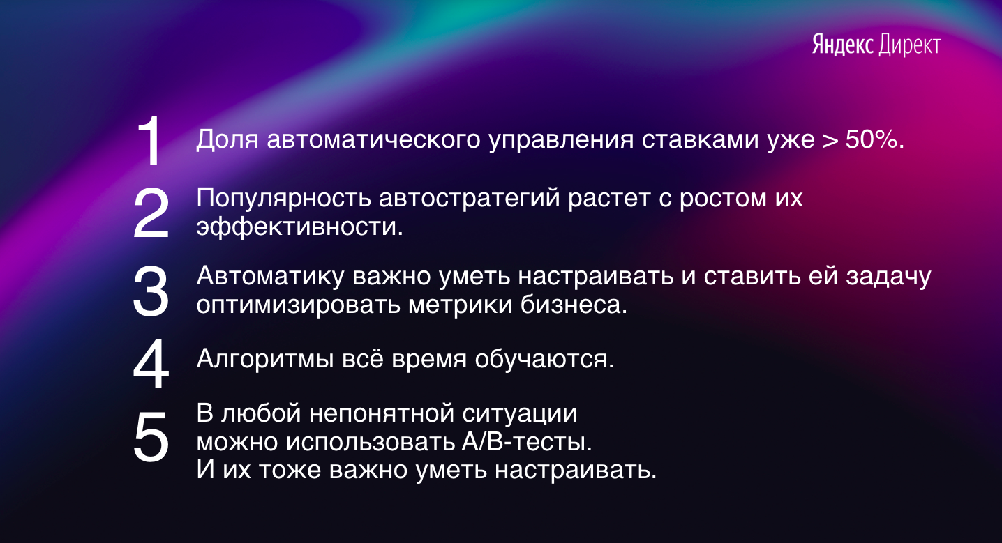 По внутренним замерам Яндекса, машинное обучение работает на 100% в 95% случаях. Автоматика уверенно побеждает ручное управление по эффективности. Этот процент обещают повысить с ростом качества технологий.