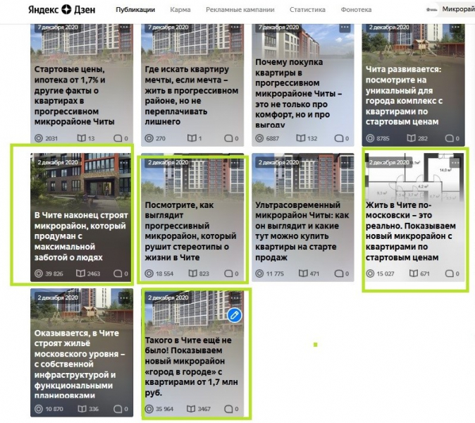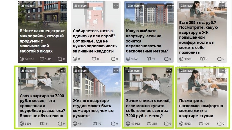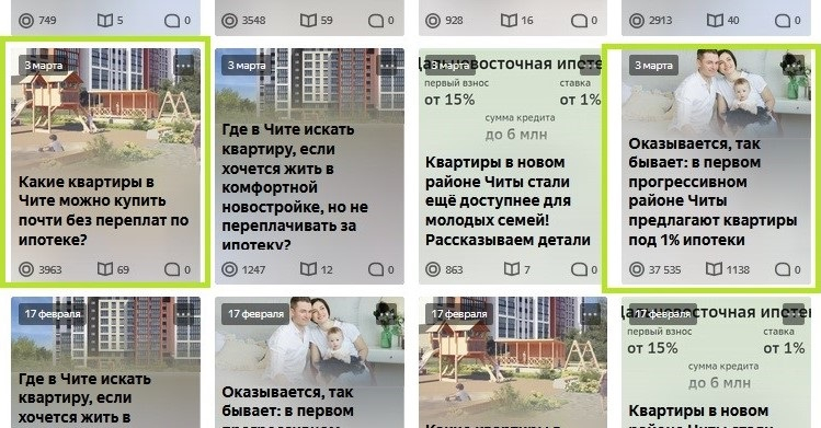Наибольшую популярность получила обзорная статья «Такого в Чите еще не было! Показываем новый микрорайон «город в городе» с квартирами от 1,8 млн рублей». В ней рассказывается, что в Чите появился современный микрорайон «Хороший» с закрытыми дворами, без машин, с новыми детскими и спортивными площадками, а также с парковыми зонами. Мы старались использовать эмоциональные заголовки и играть на контрасте со старой Читой, подробно описывая отличия жилищного комплекса от того, что привыкли видеть люди в нашем городе.