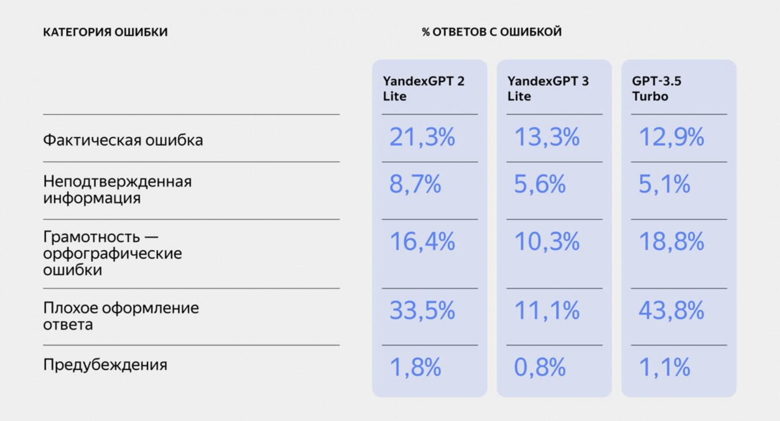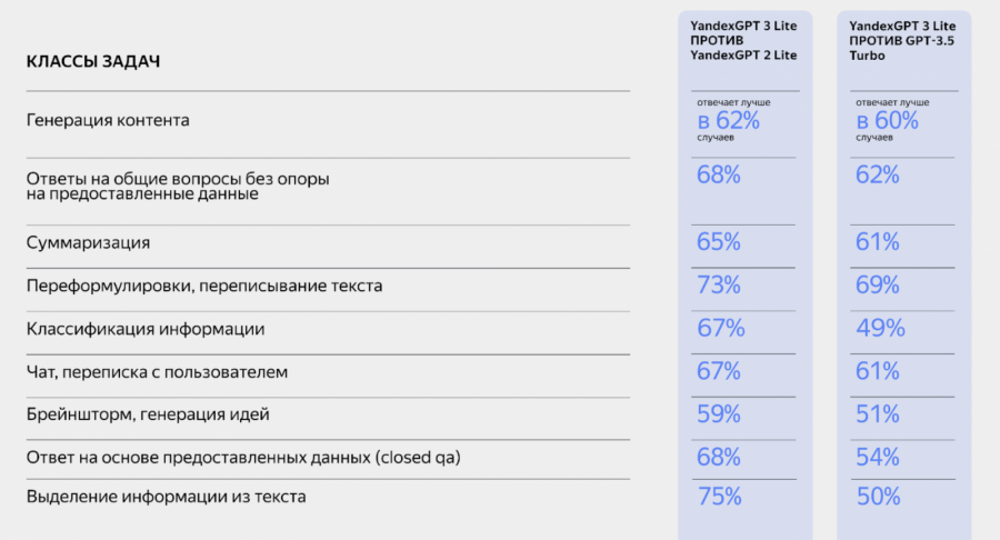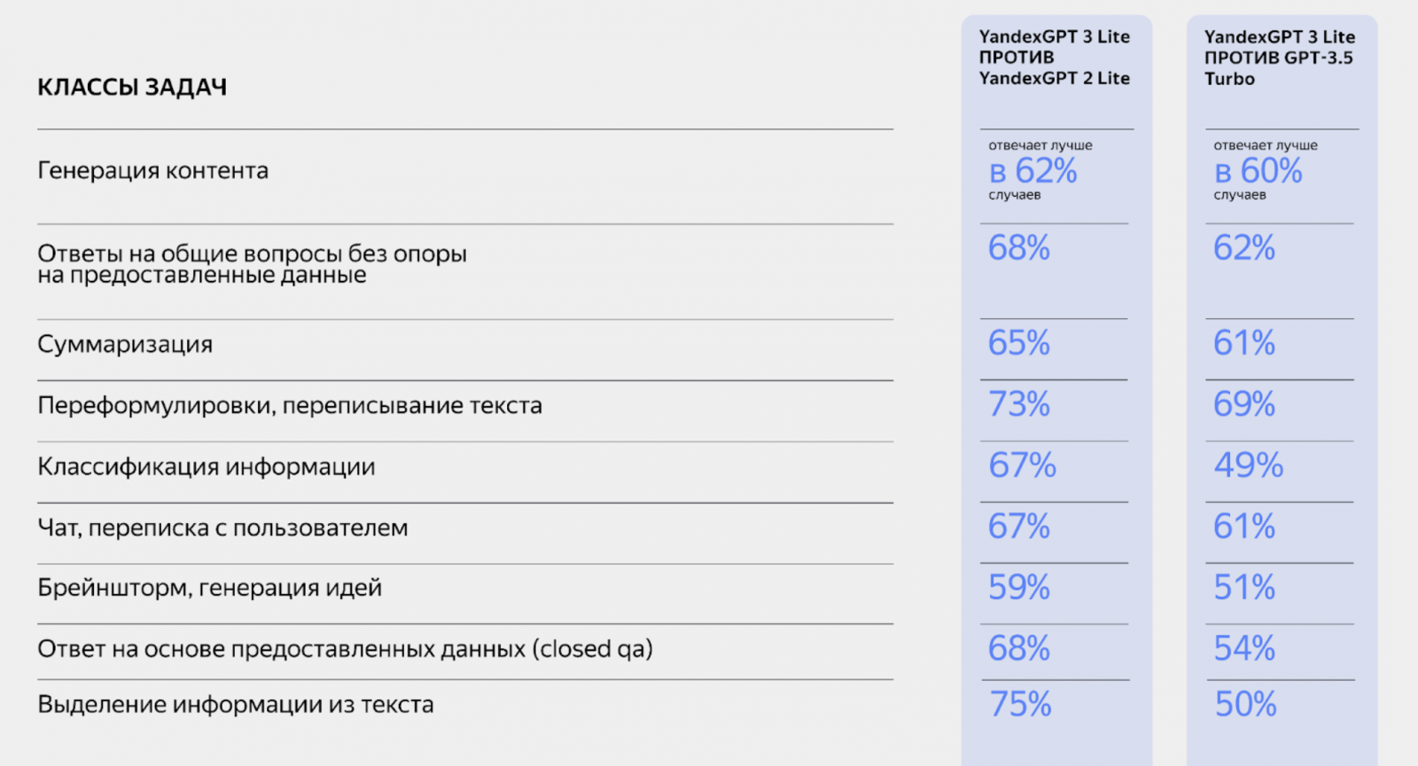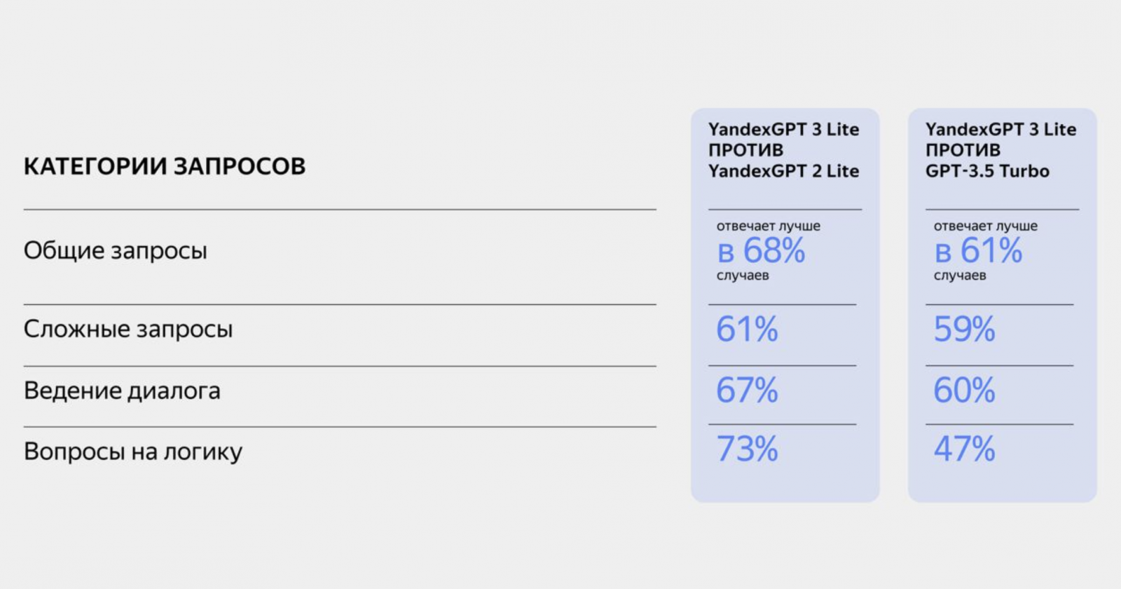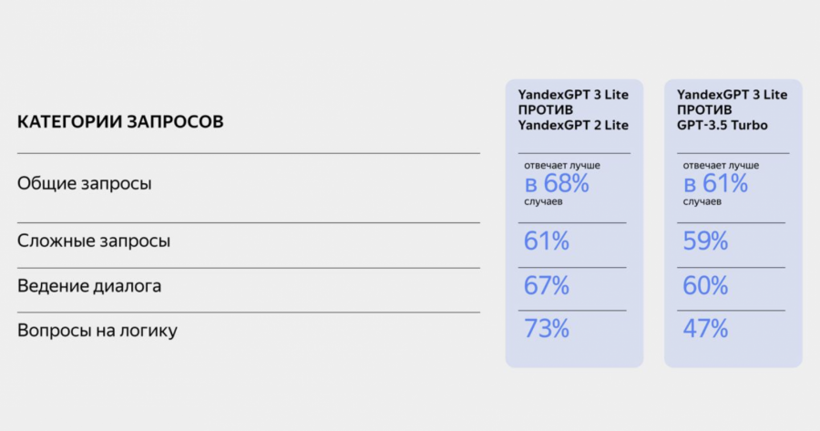Модели также сравнивали по методике side by side: нейросети отвечали на одни и те же вопросы, а эксперты выбирали лучший ответ. В среднем YandexGPT 3 Lite отвечала лучше, чем YandexGPT 2 Lite, в 68% случаев, добавили в «Яндексе».