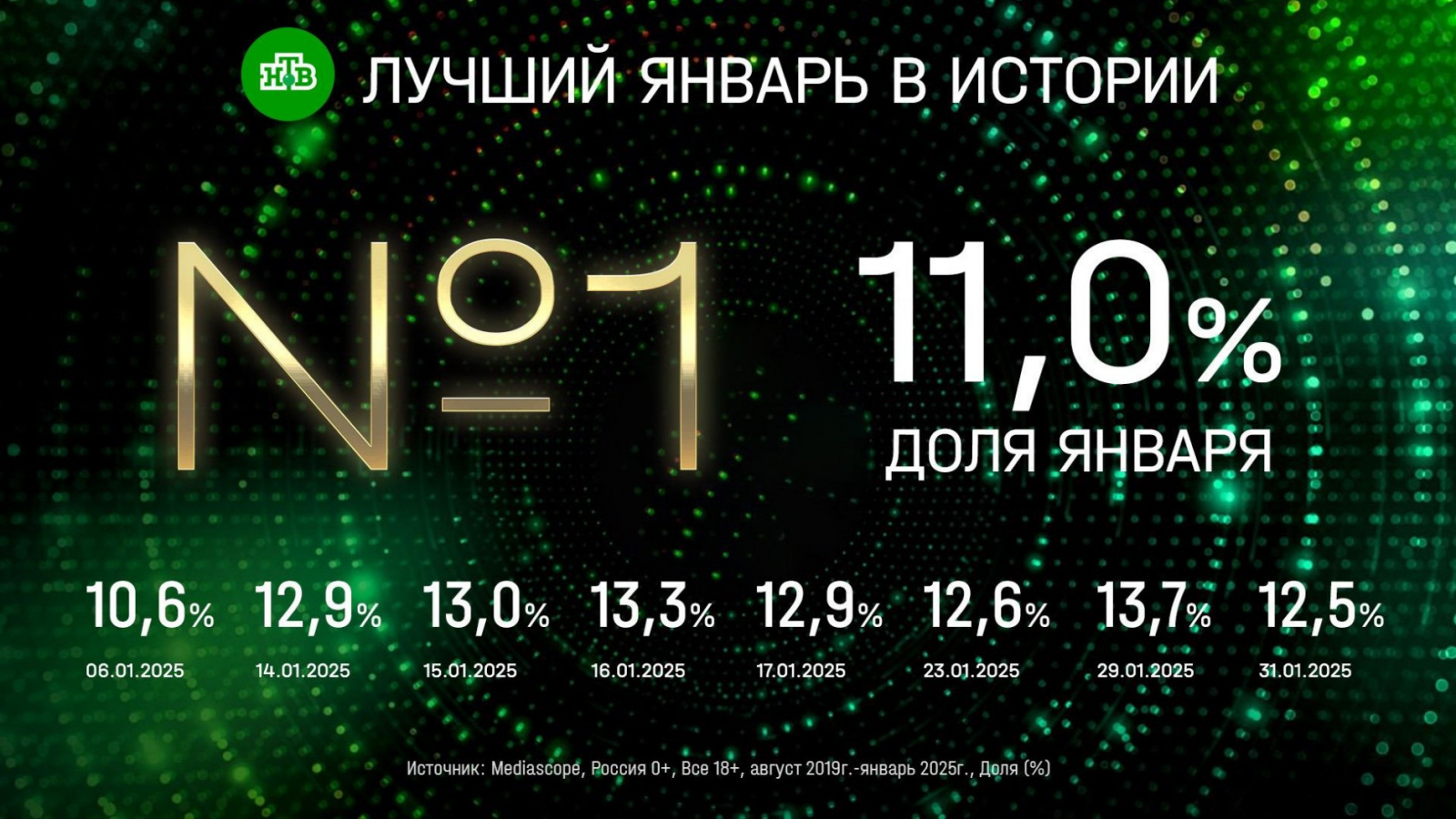 НТВ 8 дней занимал первое место в январе среди зрителей старше 18 лет: 6 января доля составила 10,6%, 14 января — 12,9%, 15 января — 13,0%, 16 января — 13,3%, 17 января — 12,9%, 23 января — 12,6%, 31 января — 12,5%. Максимальную долю — 13,7% - канал продемонстрировал 29 января.