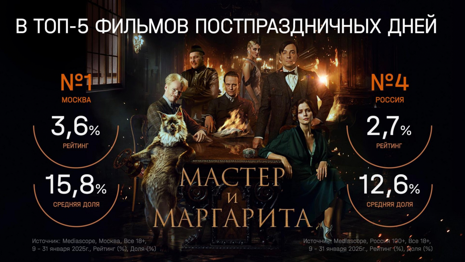 Сразу два полнометражных фильма вошли в топ лучших картин постпраздничной сетки. Романтическая сказка Ильи Учителя «Летучий корабль» с рейтингом 4,4% (доля 12,5%) стала лучшим фильмом среди зрителей всей России старше 18 лет, а «Мастер и Маргарита» с Евгением Цыгановым и Юлией Снигирь вошел в топ-5 кинофильмов среди зрителей старше 18 лет, проживающих в крупных городах. Доля московских зрителей составила 15,8% (рейтинг 3,6%): этот показатель вывел картину на первое место в аналогичный период.