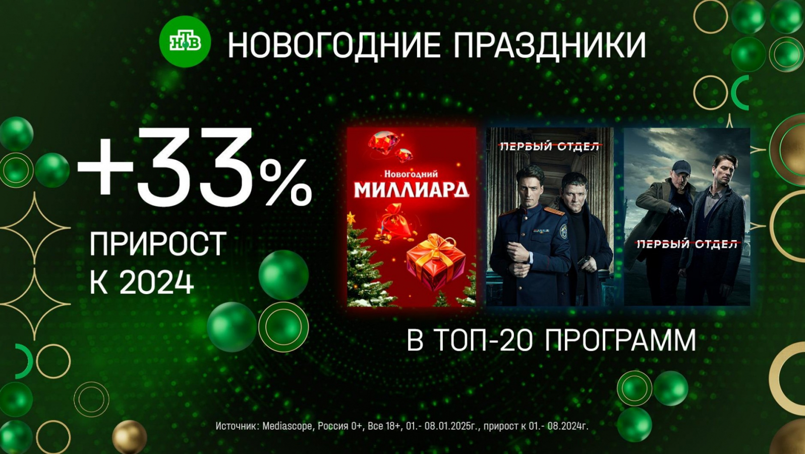 На новогодних праздниках НТВ также показал отличные результаты: прирост доли в среди зрителей старше 18 лет составил 33% относительно прошлого года. Главный розыгрыш года — «Новогодний миллиард», который НТВ показывает ежегодно 1 января в прямом эфире, — с рейтингом 3,8% (доля — 12,4%) вошел в топ-20 лучших программ в новогодние праздники.