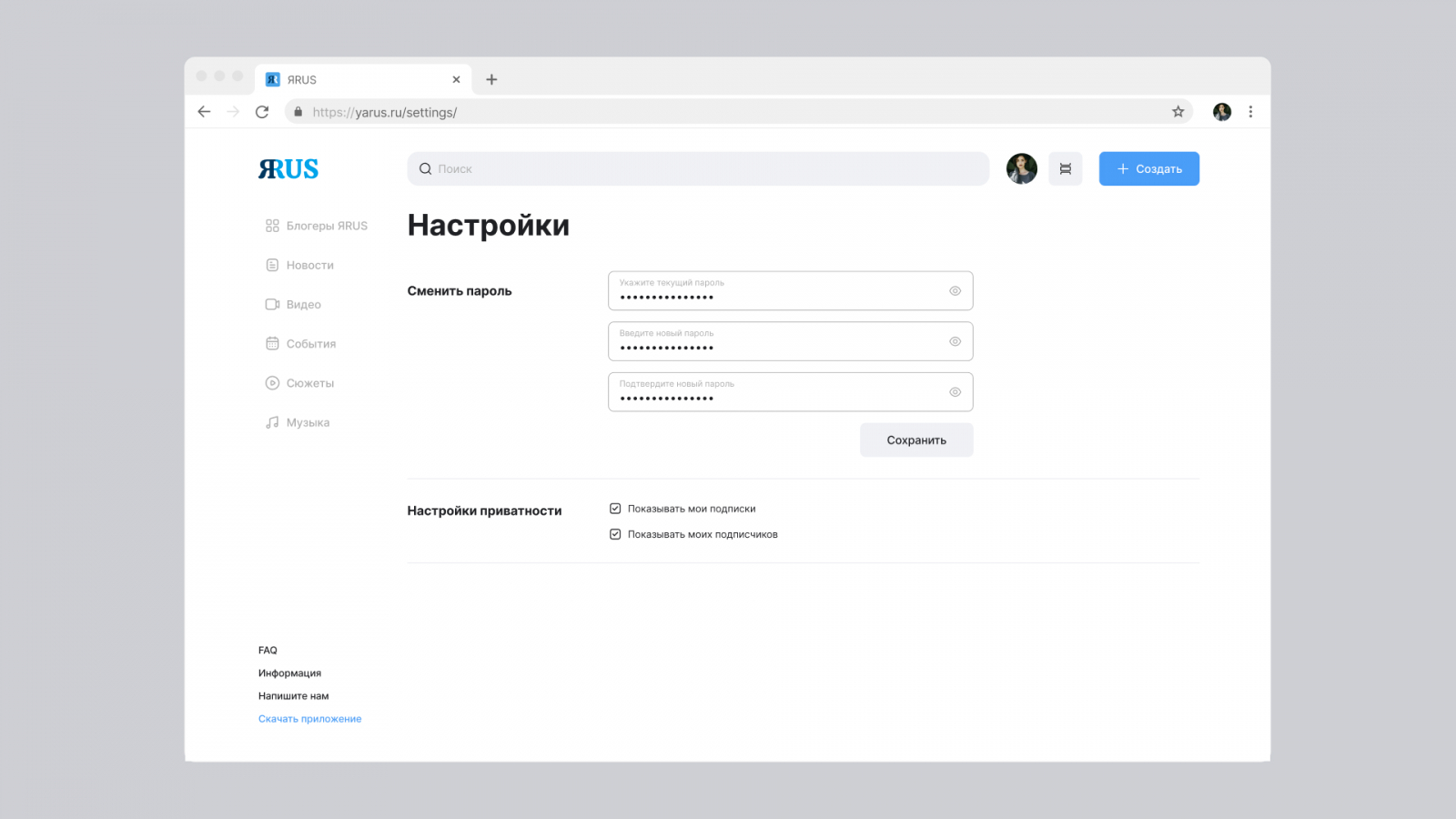 Добавилось три новых раздела, расширились возможности использования еще в четырех разделах. В разделе «Настройки» меняется пароль и настройки приватности по подписчикам и подпискам. Появились разделы FAQ и «Напишите нам».