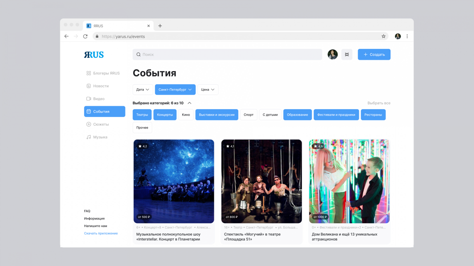 Появился выбор из 10 категорий: театры, концерты, кино, выставки и экскурсии, спорт, с детьми, образование, фестивали и праздники, рестораны и прочее.