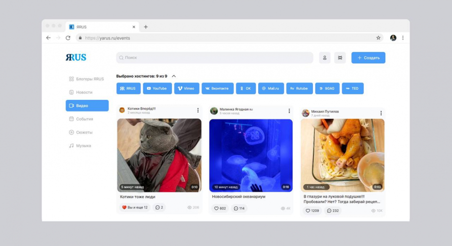 Можно выбирать из девяти видеохостингов: ЯRUS, YouTube, Vimeo, «ВКонтакте», «Одноклассников», Mail.ru, Rutube, 9GAG, TED.