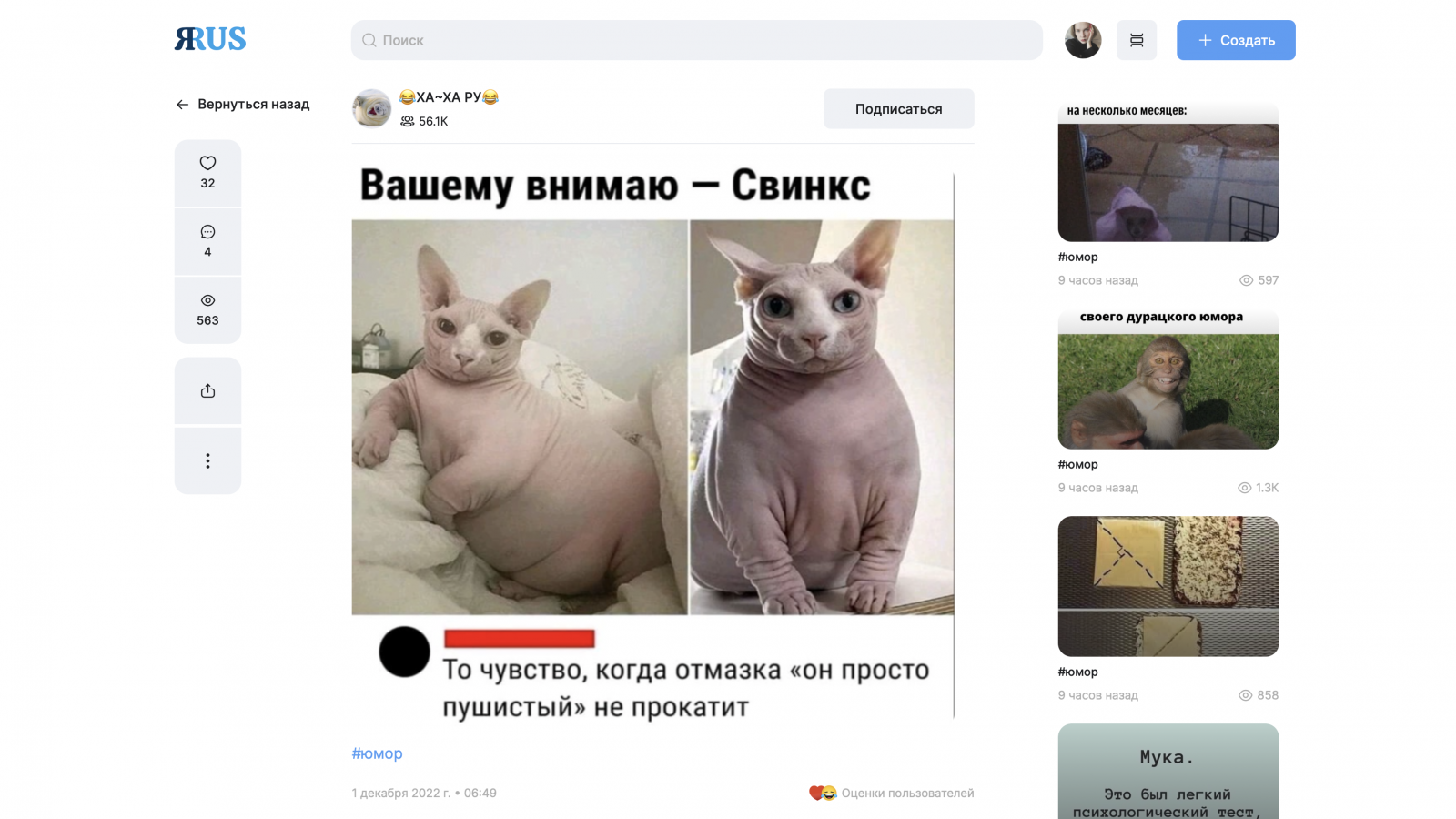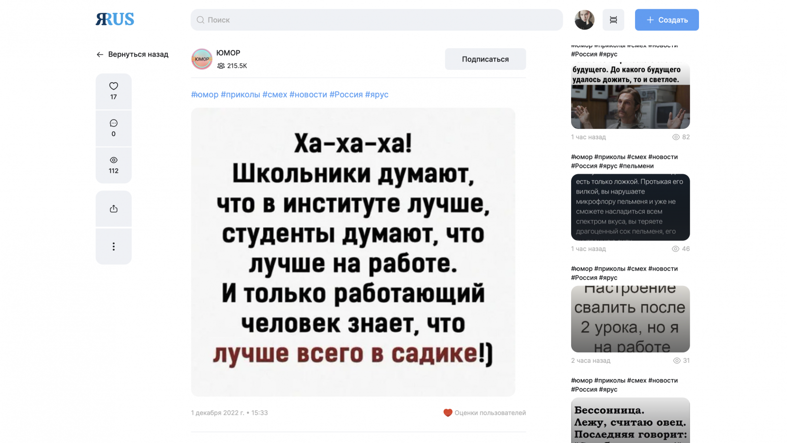 Один из старейших юмористических пабликов в приложении ЯRUS. Его модераторы стараются радовать своих поклонников, вкладывая по 15 постов в день. Каждый в отдельности набирает не много просмотров, но за счёт количества лента занимает третье место по посещаемости. Любопытно, что его основная аудитория не молодежь: возраст самых активных посетителей составляет 45 лет.