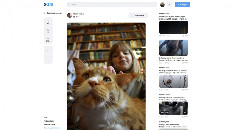 Животные с фермы во Владивостоке очень полюбились пользователям ЯRUS. Собаки и кошки соседствуют с нубийскими и альпийскими кошками, а владельцы выкладывают посты, пропитанные трепетным отношением к своим подопечным. У каждого питомца есть кличка. В ноябре, например, главной фотозвездой стал рыжий мэйн-кун Нява.