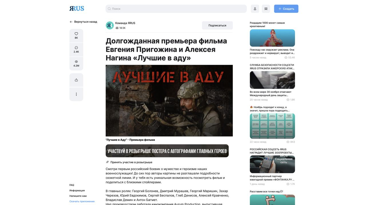 Эта лента посвящена новостям, которые имеют прямое или косвенное отношение к жизни социальной сети. Наибольший интерес у пользователей вызвал пост про премьеру фильма Евгения Пригожина и Алексея Нагина «Лучшие в аду». Он собрал 80 тысяч просмотров.