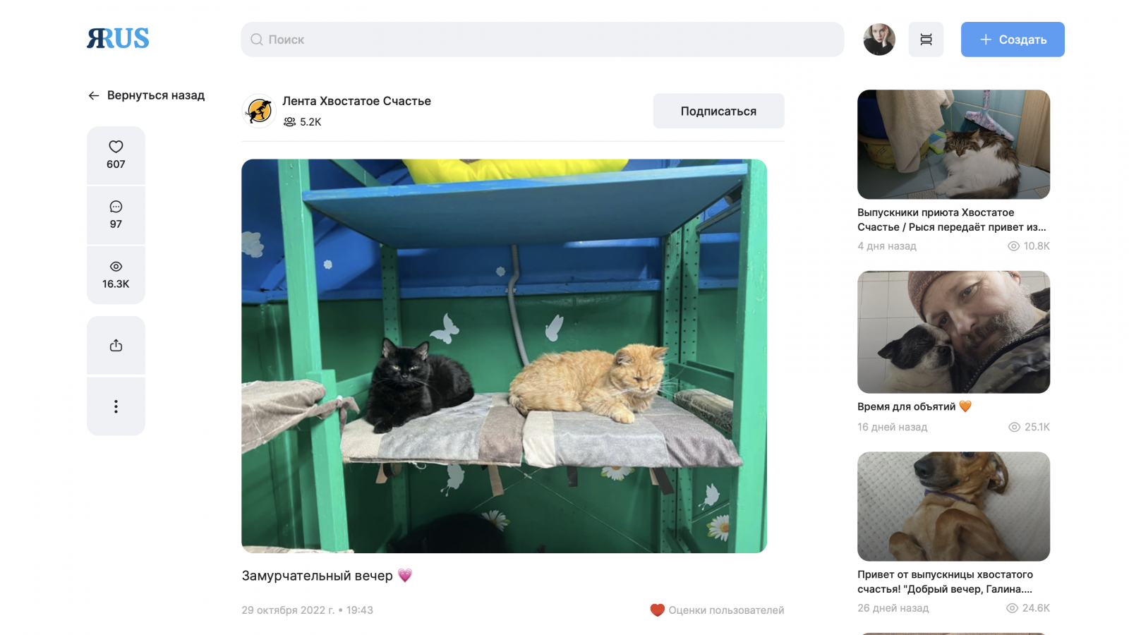 Лента приюта для бездомных животных из Первоуральска. Тепло и с неподдельной любовью рассказывая о своих подопечных, Сергей Волков задевает струны души неравнодушных пользователей приложения ЯRUS и получает помощь в виде донатов. Средств хватает, чтобы покрывать расходы на половину корма для 200 обитателей приюта.