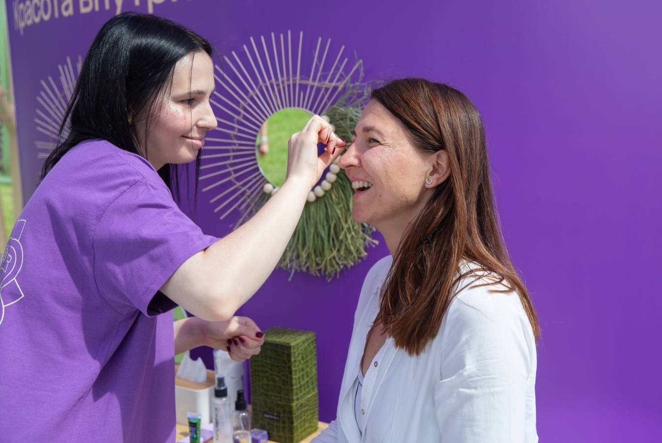 - Бьюти-зона и зона рефреша: продумали детали отдыха гостей после активных сессий йоги. В зоне с визажистами можно было освежить макияж, нанести флеш-тату и глиттер, а также использовать мисты для лица. Всё пространство было оснащено так, чтобы участники могли восстановиться и продолжить фестивальные активности.