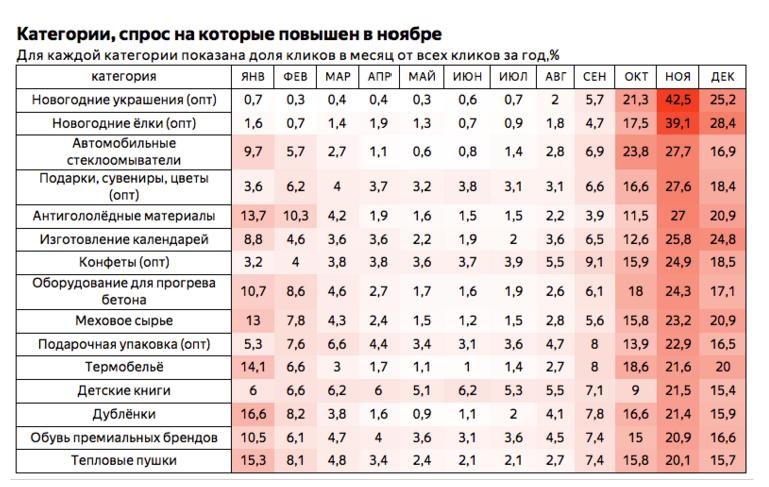 Так, в ноябре сильнее всего растёт интерес к объявлениям об оптовых поставках новогодних украшений и ёлок. Подарки, сувениры, конфеты, детские книги и упаковка тоже становятся особенно актуальны. Заметно увеличивается спроса на тёплые вещи — термобельё, дублёнки и обувь премиальных брендов, а также на антигололёдные материалы и тепловые пушки.
