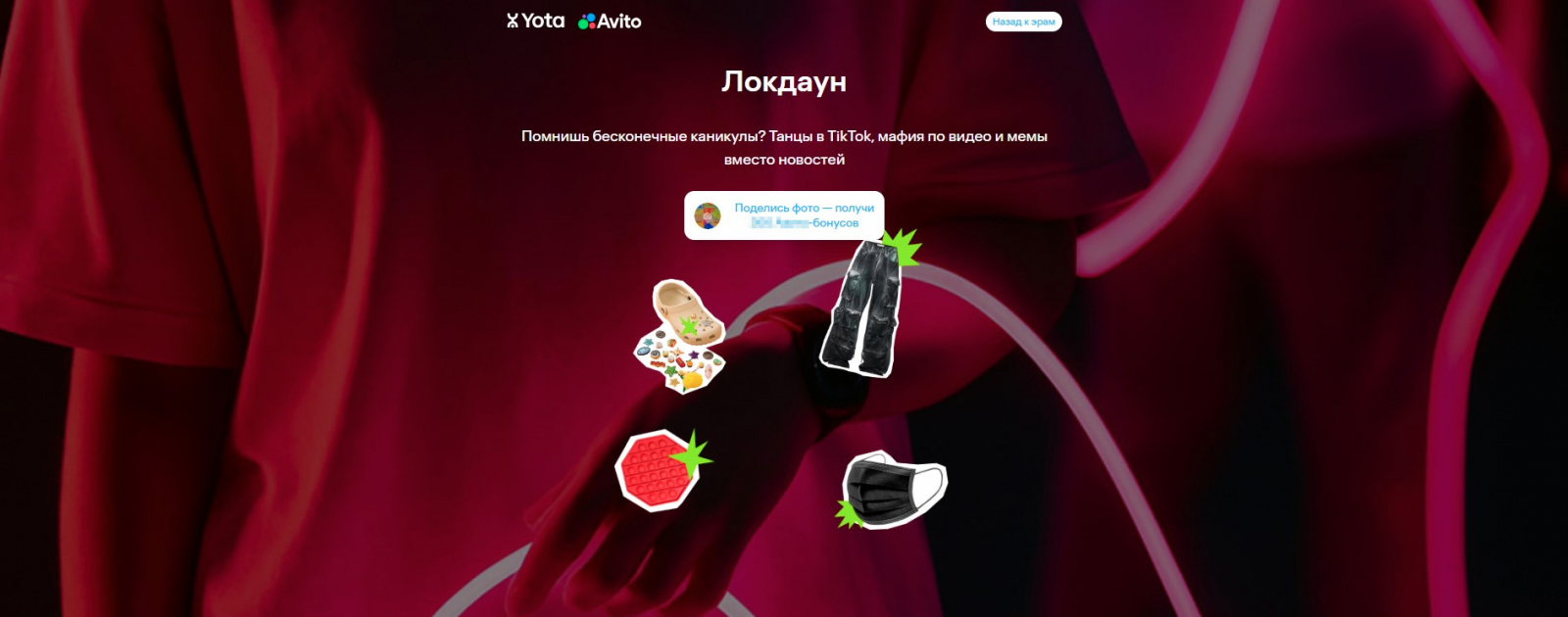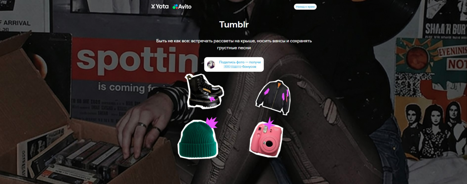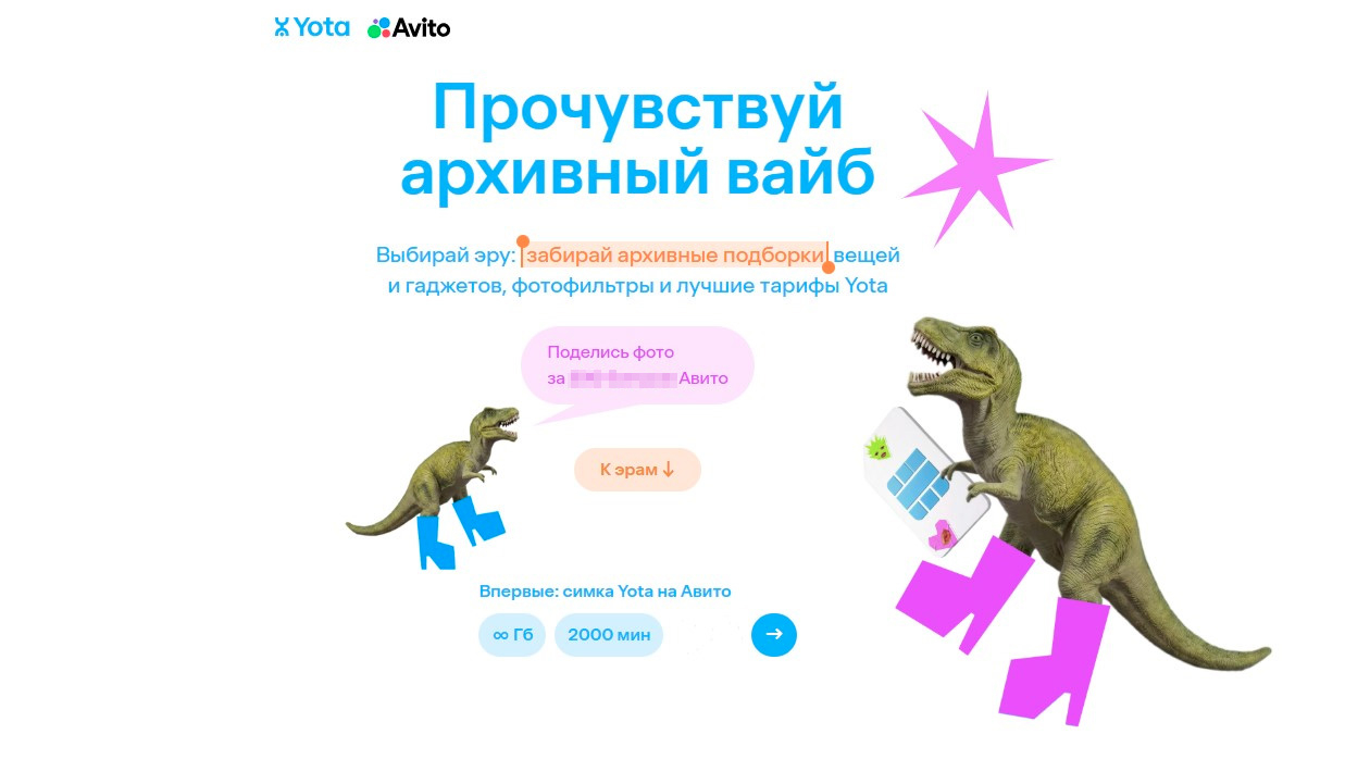 Спецпроект развивает идею платформы «YotaАрхив», где тарифы переосмысляются через культурные коды времени: в нулевых — звонки и SMS как социальный клей, в десятых — безлимит как базовая необходимость. На промолендинге собраны пять ключевых эр: нулевые, тамблер, хип-хоп, локдаун и настоящее. Каждой эре соответствует свой архивный тариф Yota и подборка винтажных товаров, представленных на «Авито».