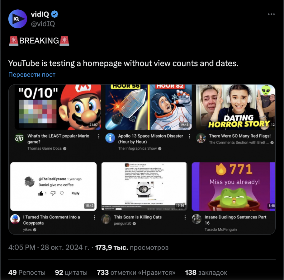 YouTube тестирует новый интерфейс главной страницы, где скрыты просмотры видео и дата их публикации. Об этом в социальной сети X сообщила платформа vidIQ.