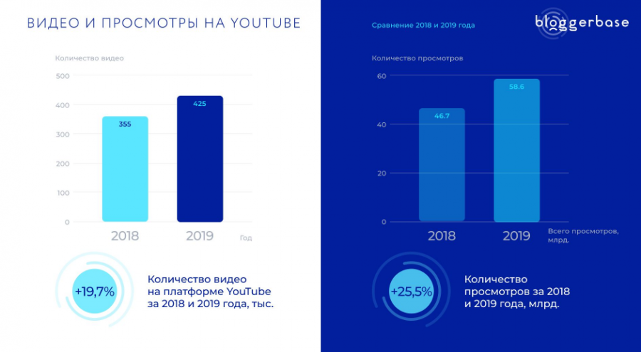 Количество видео на российском YouTube за год выросло на 20% по сравнению с 2018 годом, а подходящие для рекламы — на 13,2%. Если соотнести потенциально возможные видео с рекламными, то за год доля выросла на 70%. При учете роста общего числа видео за последний год, в 2019 году доля подходящих для рекламы видео составляет 48,5%.