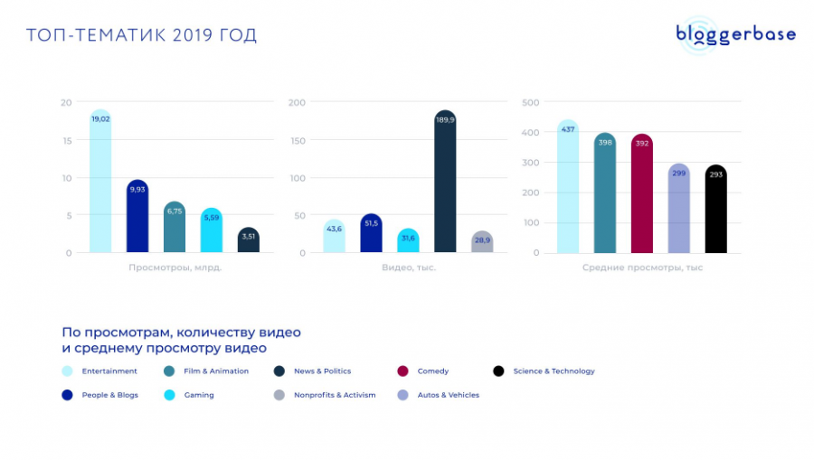 Исходя из анализа среднего количества просмотров видео, эксперты выделили топ популярных тематик. На первом месте — entertainment (детский контент, шоу и развлекательные передачи), на втором — «фильмы и анимация», далее — «комедия», «авто», «наука и технологии».