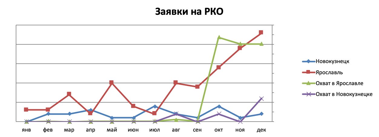В Ярославле (красный график), где усилили PR-активность (зеленый график), значительно выросло количество обращений в банк. В контрольном городе (синий график) кривая обращений осталась без изменений.