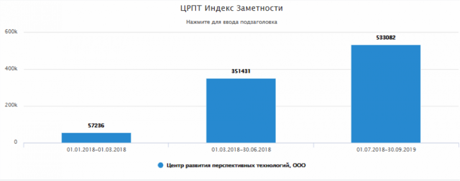 Так, на графике ниже видно, как росла заметность в СМИ «Центра Развития Перспективных Технологий», новой компании для рынка. С ростом упоминаний в ТАССе, РИА, «Интерфаксе», РБК, на Первом канале и в прочих больших СМИ, пресс-службе удалось повысить узнаваемость компании в деловой среде.