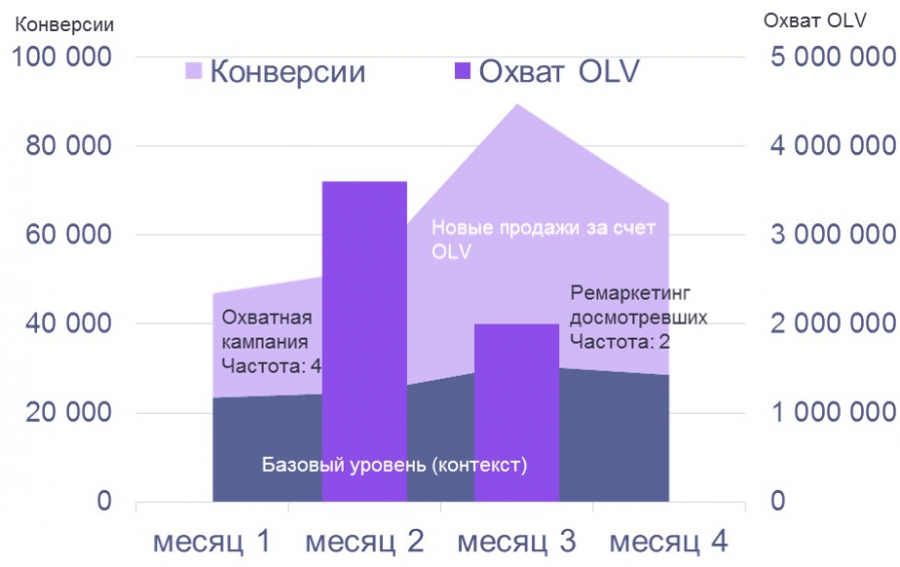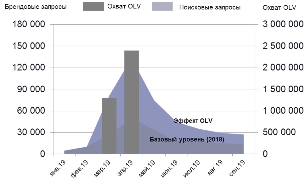 В обоих показанных выше примерах речь шла об охватах нескольких миллионов пользователей, что и давало такой существенный прирост спроса на продукты. Однако надо понимать, что у онлайн-видеорекламы значительный отложенный эффект. Пользователь, посмотревший ролик, может прийти на сайт через неделю или через месяц. У нас есть примеры кампаний, когда 40% покупок было зафиксировано в течение двух месяцев после окончания видеокампании. Учитывая этот отложенный эффект, необходимо предусмотреть способы не упустить пользователей. И поскольку они чаще всего возвращаются на сайт продукта через поисковые запросы, то здесь требуется хорошая синергия с поисковой рекламой.