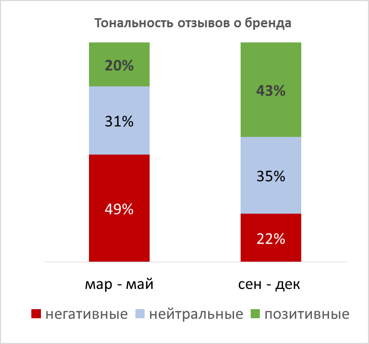 Летом из-за каникул было затишье, а осенью выплески негатива возобновились, но к тому моменту нам уже удалось сформировать позитивный фон с конструктивной аргументацией и пул адвокатов бренда. Развитие критических дискуссий в соцмедиа как правило затухало естественным образом, именно после того, как в них вступали защитники новых подходов с конструктивными аргументами, которыми уже оперировали традиционные СМИ.