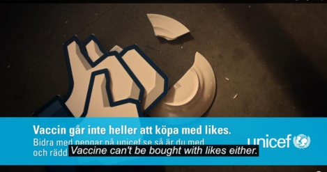 Организация запустила в Швеции три видеоролика, рассказывающих о бесполезности «лайков», когда речь заходит о реальной помощи людям и призывающих внести пожертвования на покупку вакцины для детей. Сколько бы ни было поклонников у той или иной страницы на Facebook, средств на оказание помощи нуждающимся не прибавляется. В той же ситуации находится ЮНИСЕФ.