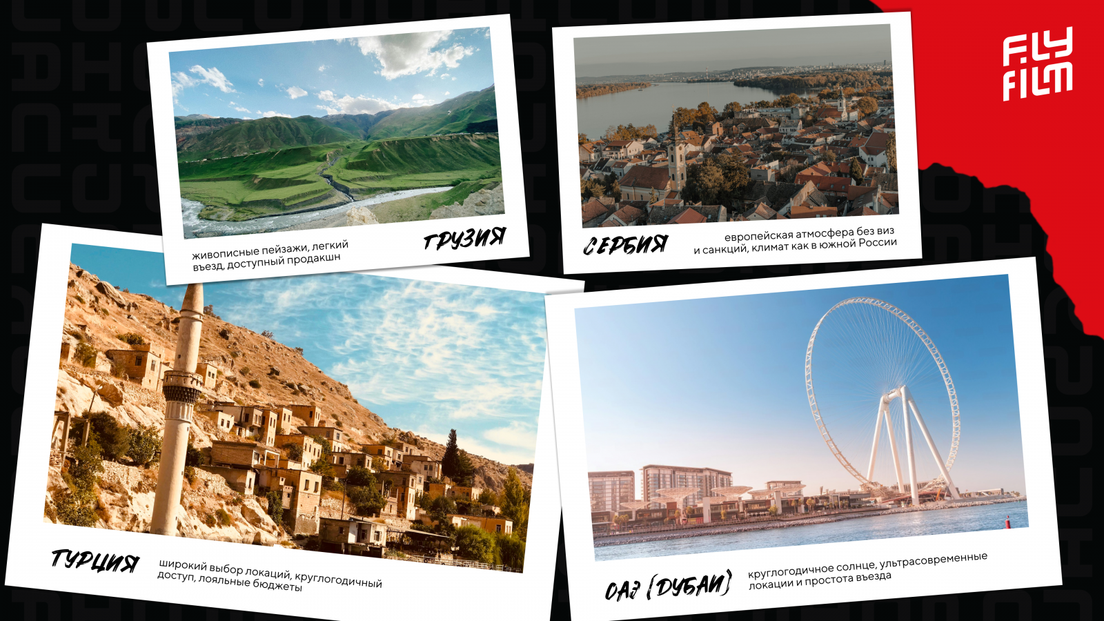 - ОАЭ (Дубай) — круглогодичное солнце, ультрасовременные локации и простота въезда, прямое авиасообщение с Москвой. Основное окно для съемок — осень и зима из-за летней жары.