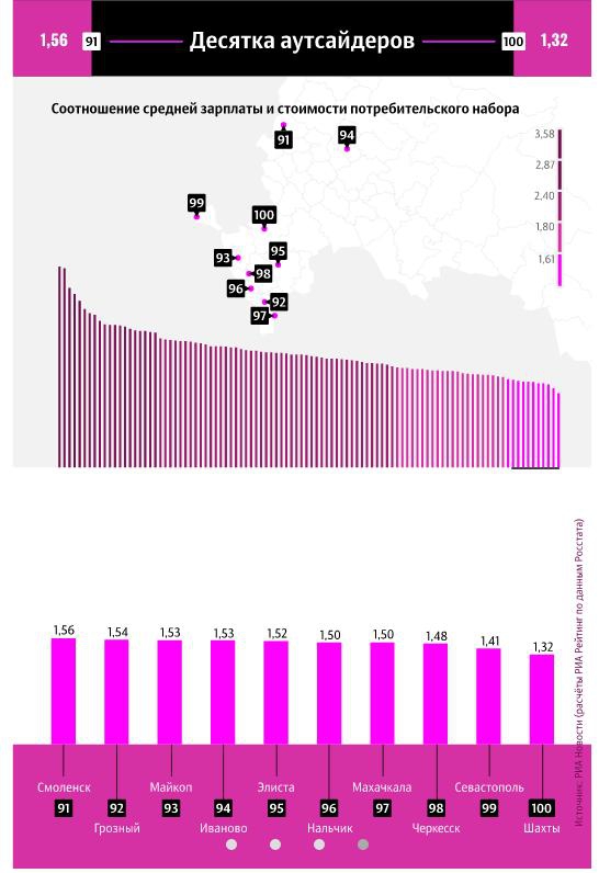 Места с 96-го по 98-е занимают столицы кавказских республик — Нальчик, Махачкала и Черкесск, так как на Северном Кавказе традиционно низкие зарплаты, которые не могут компенсировать даже невысокие цены. На предпоследнем месте расположился Севастополь (1,41), при этом эксперты отмечают, что высокие цены в городе объясняются спросом со стороны туристов и военных, а выплаты военным не учитываются в статистике зарплат.