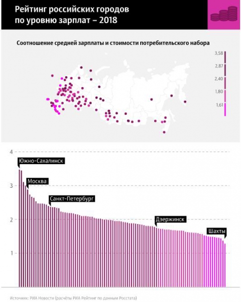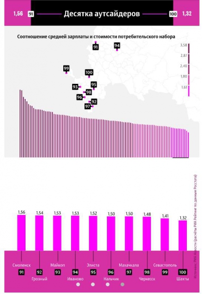 Самые низкие зарплаты зафиксированы в городе Шахты Ростовской области, Севастополе, Нальчике, Махачкале и Черкесске. В Шахтах (последнее место в рейтинге) соотношение зарплаты и фиксированного набора составило 1,32. То есть средней зарплаты в этом городе хватает лишь на стандартный набор — накопить на машину и жилье, а также содержать детей сложно большинству жителей.