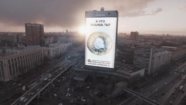На здании Гидропроекта в Москве на экране самого большого в мире смартфона демонстрируются снимки Александра. Через приложение Shazam прохожие могут перейти на промостраницу кампании «За горизонт» и узнать детали. Проект реализован совместно с порталом Zuzza.