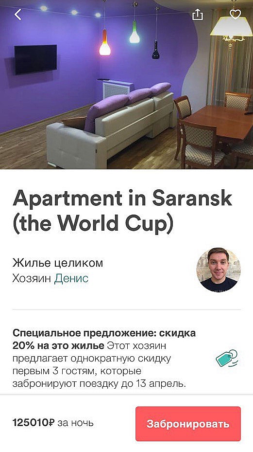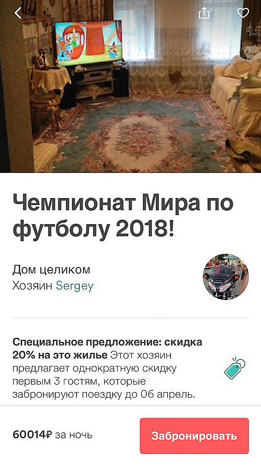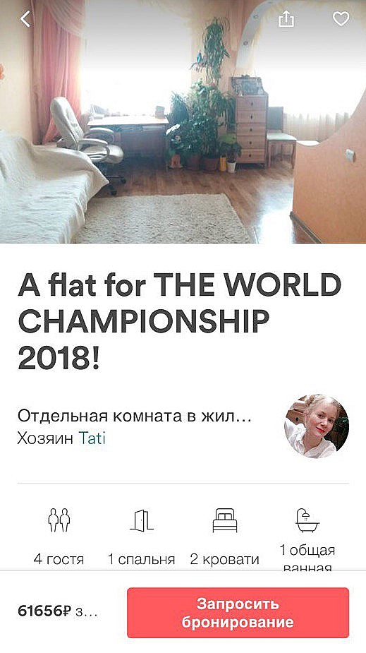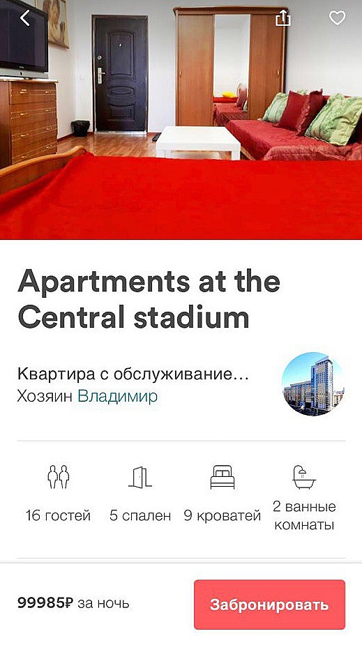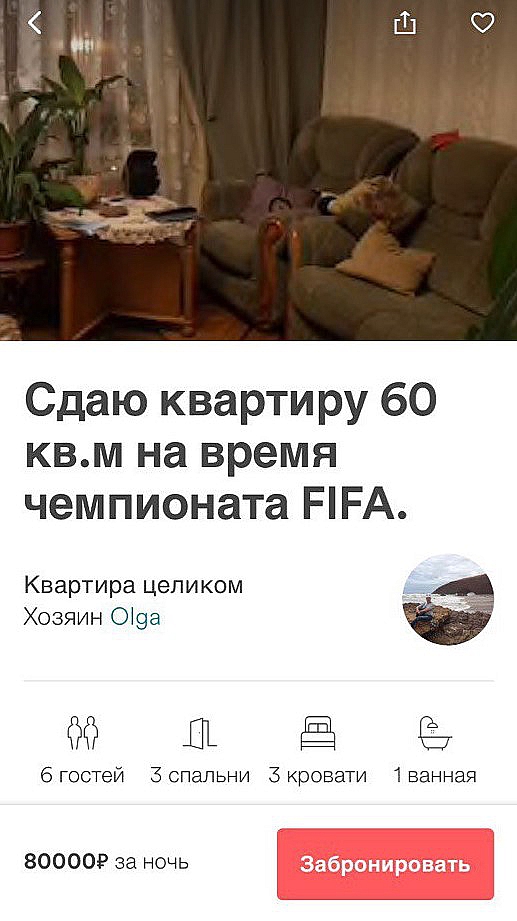 Обладатели «свободной» недвижимости поспешили выставить ее на Airbnb — онлайн-площадке для размещения, поиска и краткосрочной аренды жилья. Однако цены на квартиры поражают даже самых активных поклонников футбола, готовых оставить во время этого спортивного праздника кругленькую сумму.