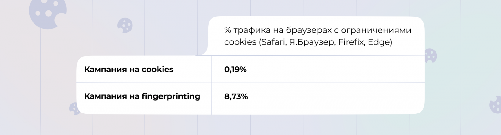 2. Получили доступ к более широким охватам для взаимодействия в интернете. Значительная часть пользователей кампании Fingerprinting пришла из браузера Safari. Этот браузер ограничивает работу third-party cookies — можно показывать контекстную рекламу, но таргетироваться на заранее собранный сегмент невозможно. Fingerprinting же сделал эту опцию доступной.