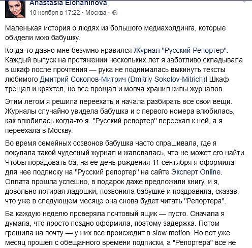 Она рассказала, что в сентябре оформила и оплатила подписку на сайте «Эксперта». Когда же ее бабушка не получила журнал, выяснилось, что медиахолдинг «заморозил» бумажный «Русский репортер». Представители компании не смогли сообщить, выйдет ли ноябрьский номер, и предложили либо подождать, либо вернуть деньги.