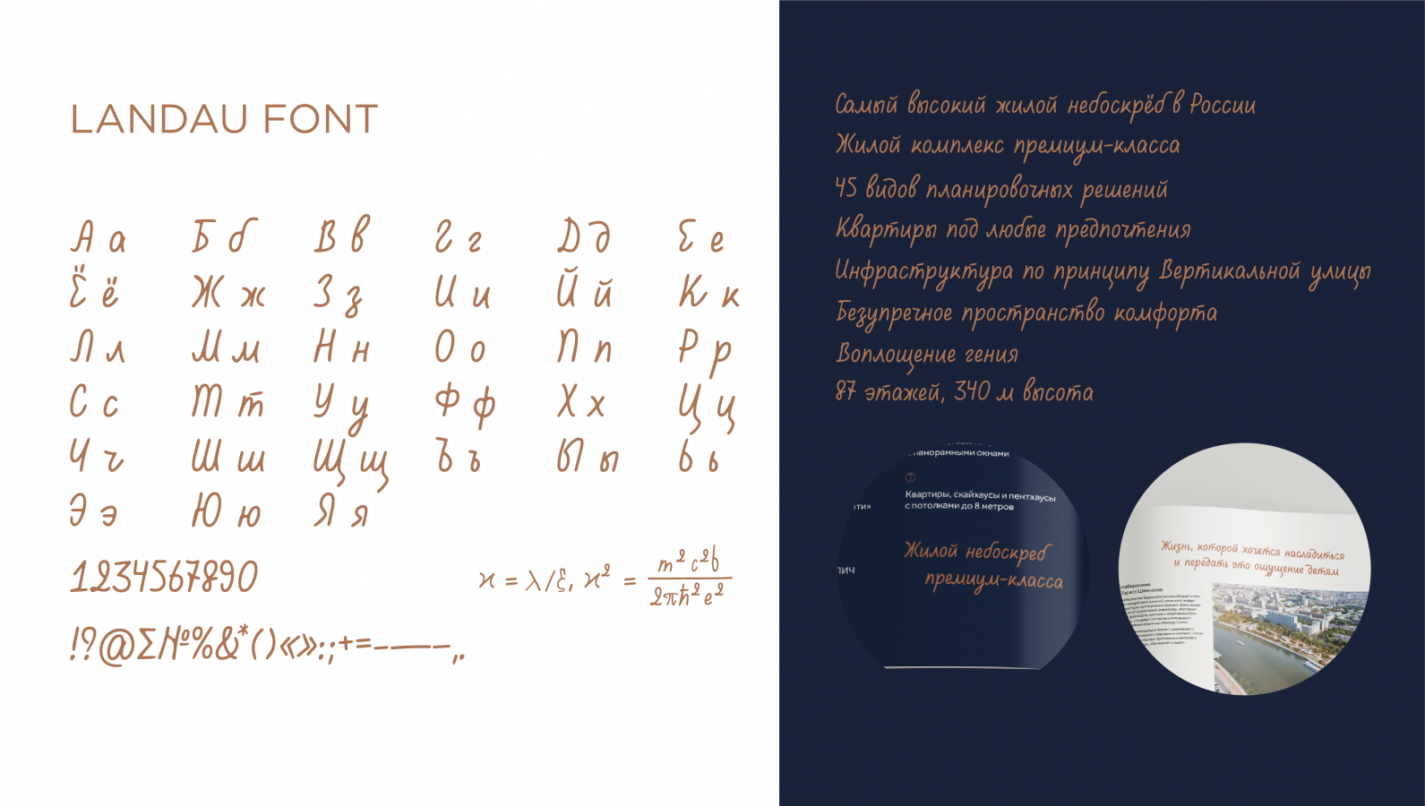 Эта мысль стала отправной точкой для позиционирования и помогла сформировать новую креативную концепцию проекта — «Гений Точности». Оно позволило перераспределить акценты таким образом, чтобы концепция воспринималась не как прямое посвящение ученому, а скорее как символ тех фундаментальных принципов, которые Ландау успешно применял в науке, а «Сумма Элементов» — в архитектуре и строительстве. Кроме того, было решено использовать почерк Ландау в качестве шрифта для айдентики.