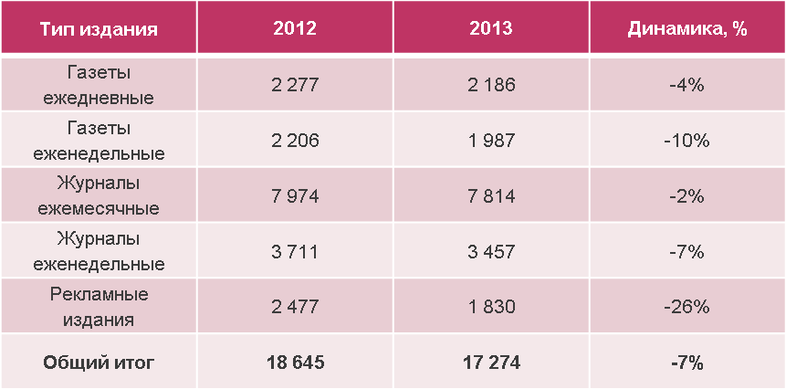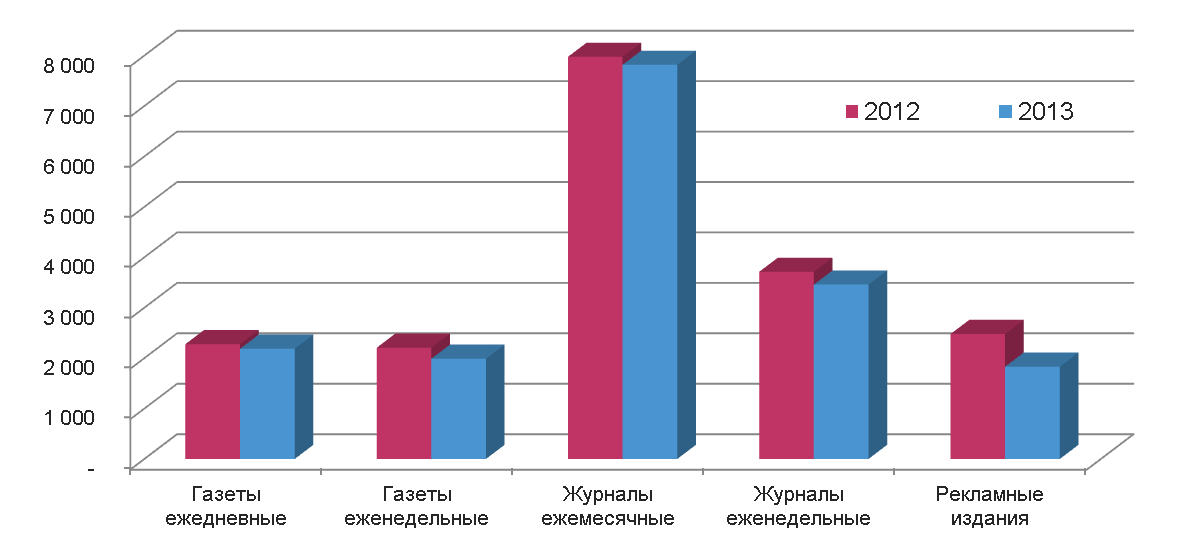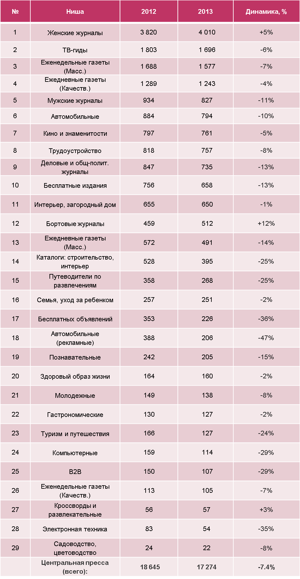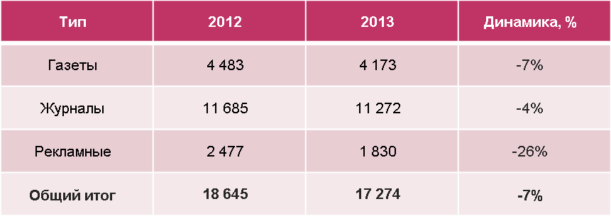 Если не считать ниши, основой которых служат рекламные издания, то наибольшие потери понесли «Путеводители по развлечениям» (-25%), «Туризм и путешествия» (-24%), «Компьютерные» (-29%), «B2B» (-29%), «Электронная техника» (-35%), т.е. те ниши, на которые особенно сильно давят конкурирующие с ними по тематике интернет-ресурсы.